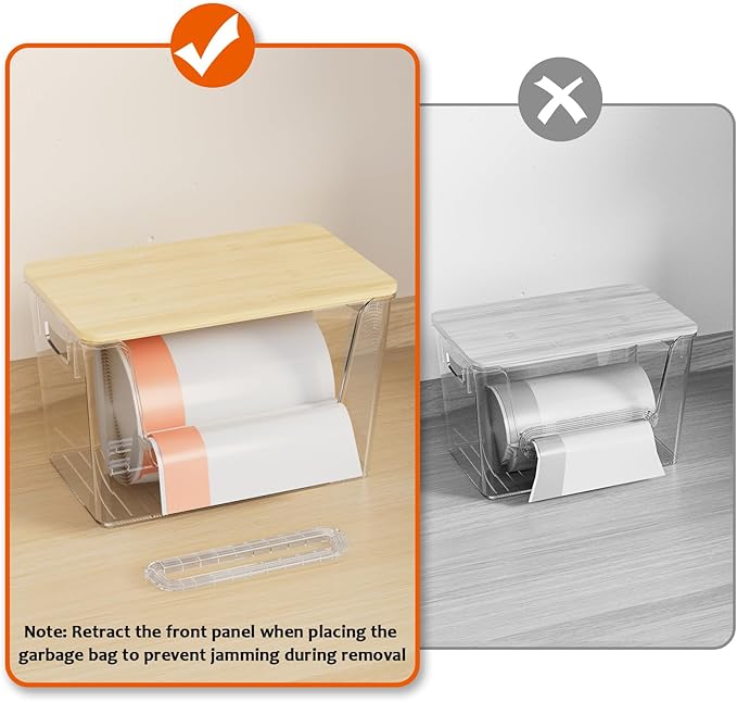 Stackable Pantry Organizers and Storage: overall size: 11-7/32″L*7″W*7-1/8″H. The bamboo lids: 11.22″L*7″W*0.60″H. Large Opening Front: 7.68″L*5.32″H. The large capacity trash bag holder is designed to accommodate most standard and large roll garbage bags, includes 4/8 /13 gallon most sizes, which meets the needs of ordinary kitchen laundry storage. Our Pantry organizers stand out because although there is an opening in the front, we have added a flexible stopper that can be removed and installed at any time, which effectively prevents items from being placed too full and falling out of the open opening